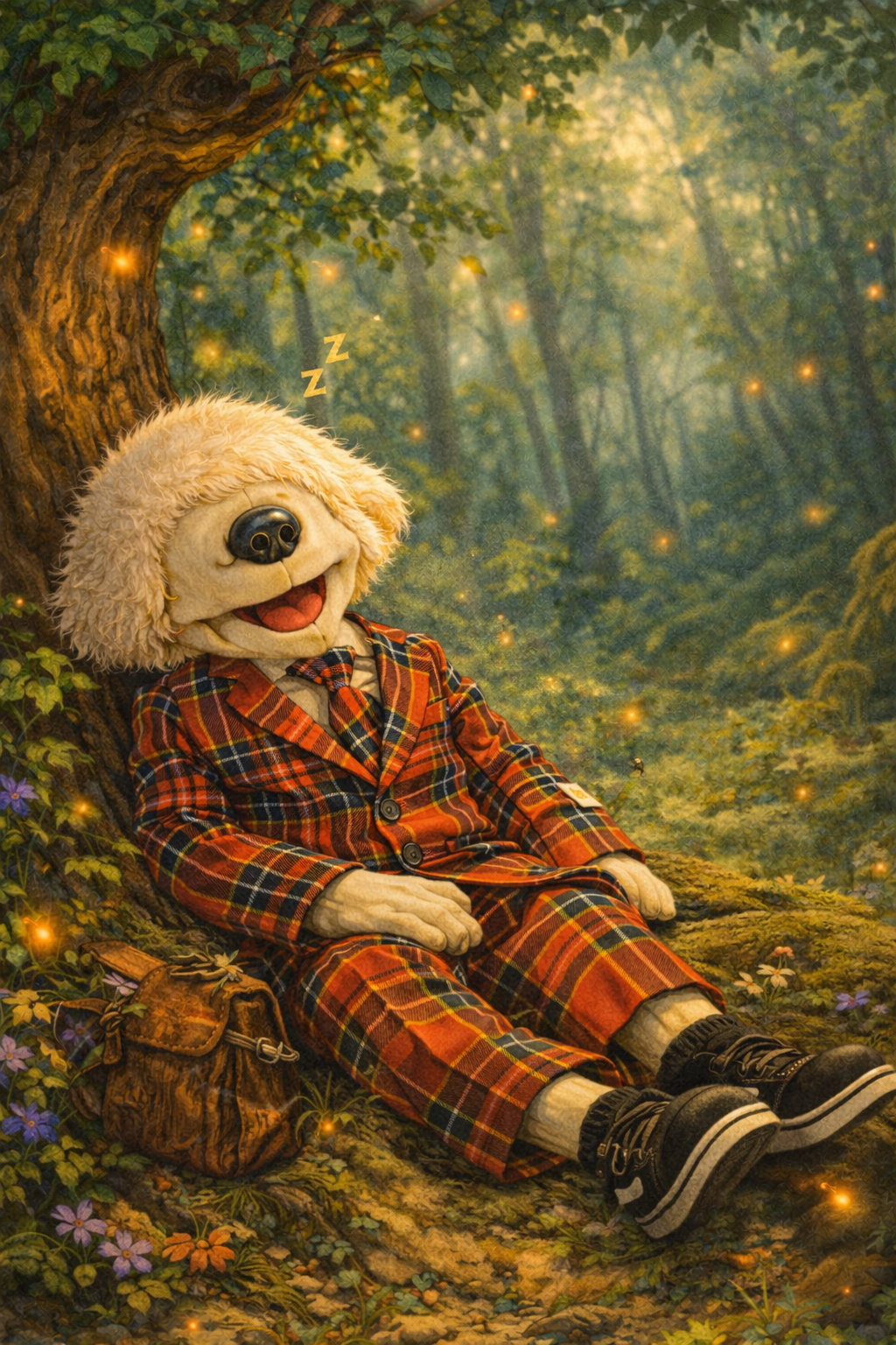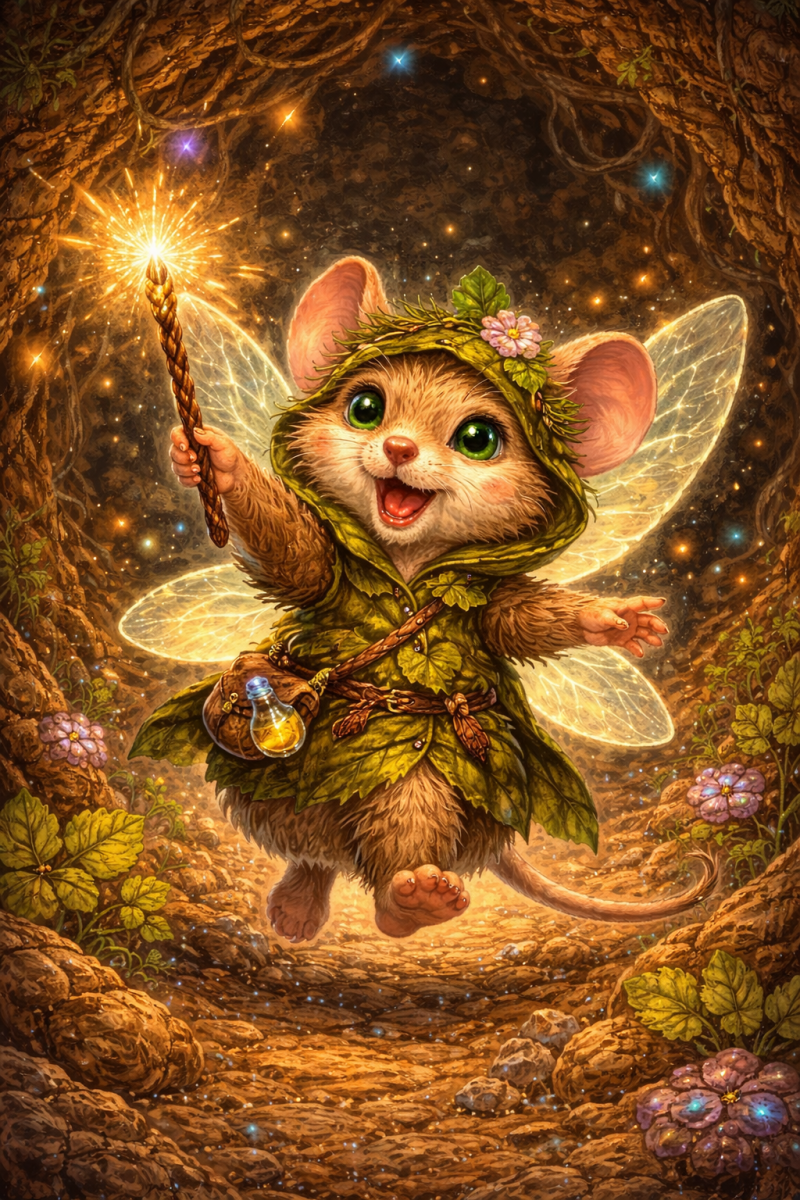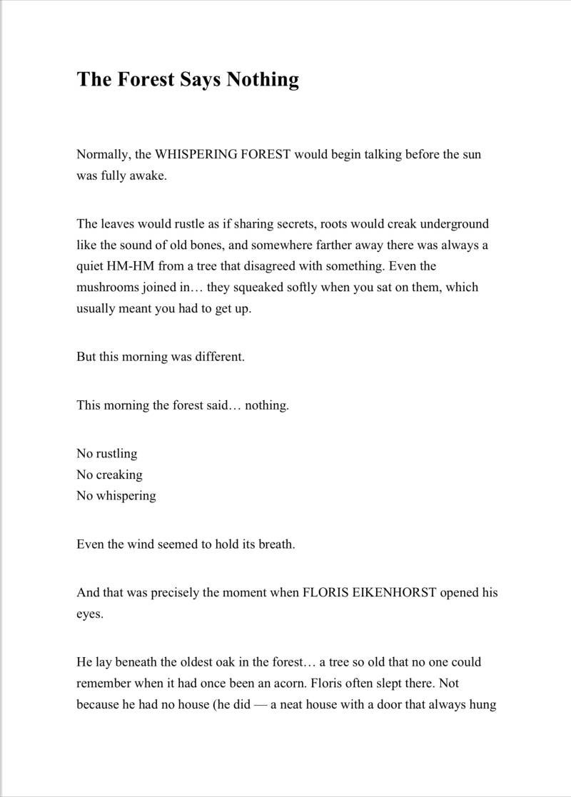 De bladeren ritselden dan alsof ze elkaar geheimpjes vertelden, wortels kraakten onder de grond als het geluid van oude botten, en ergens verderop klonk altijd wel een HM-HM van een boom die het ergens niet mee eens was. Zelfs de paddenstoelen deden mee…die piepten zachtjes als je erop ging zitten, wat meestal betekende dat je eraf moest.