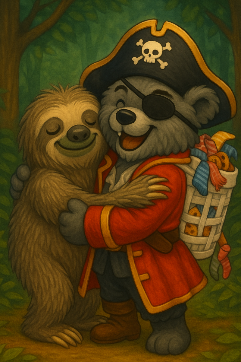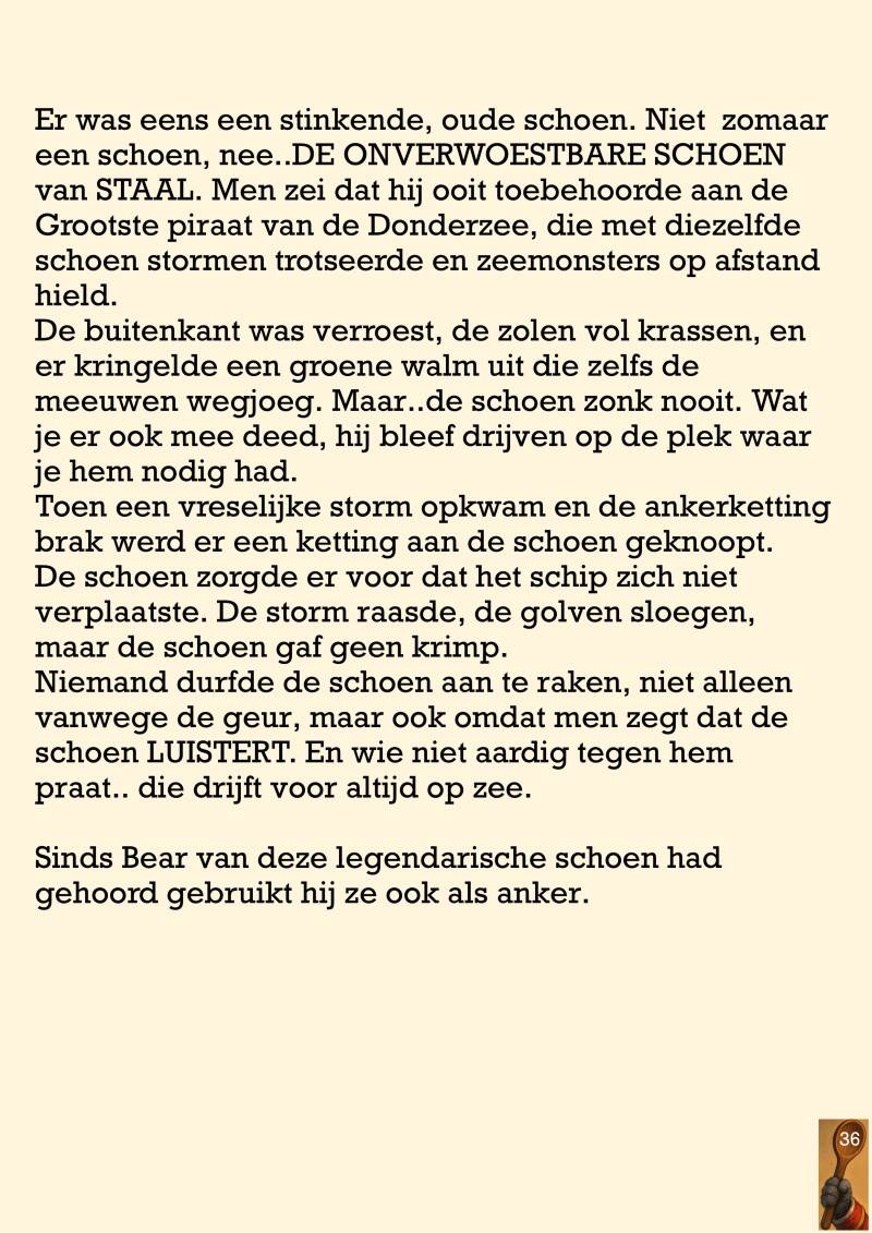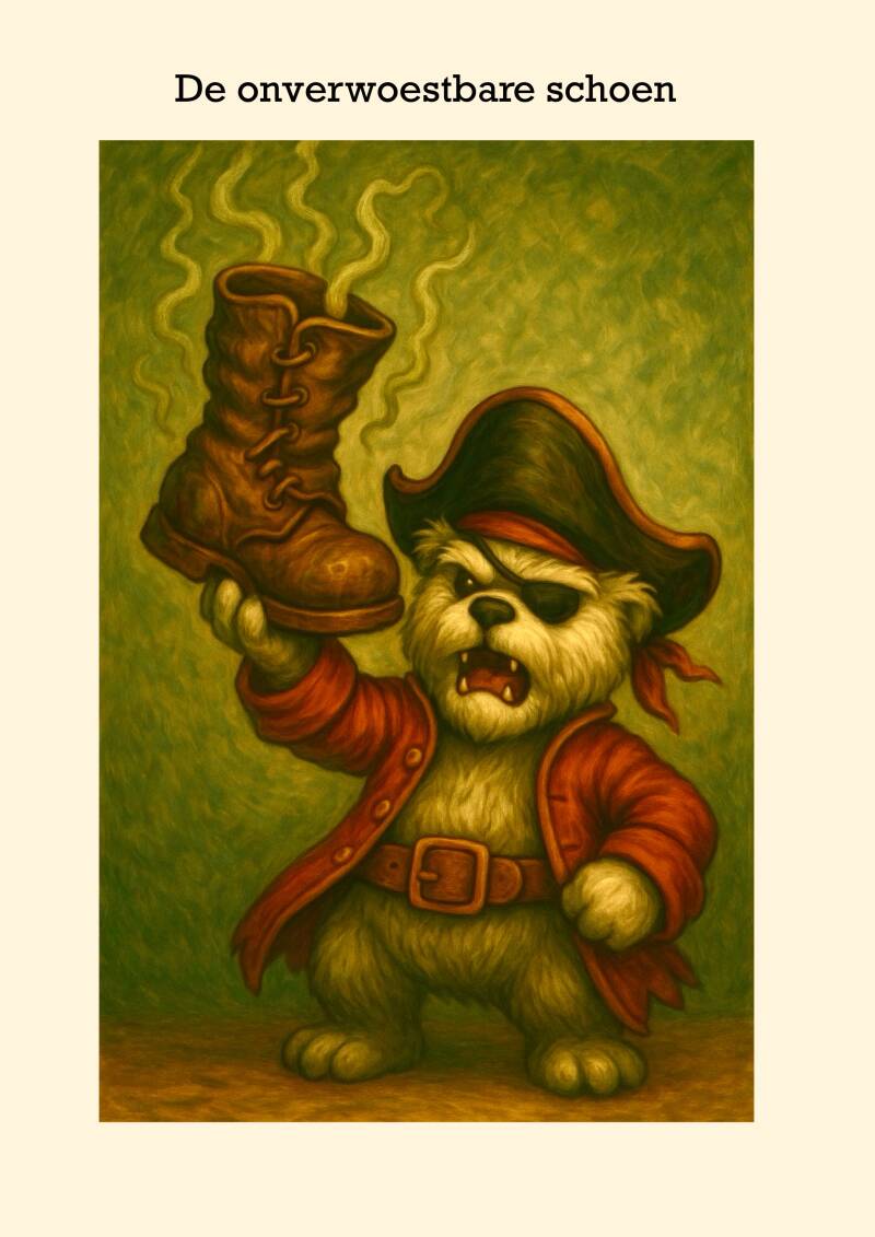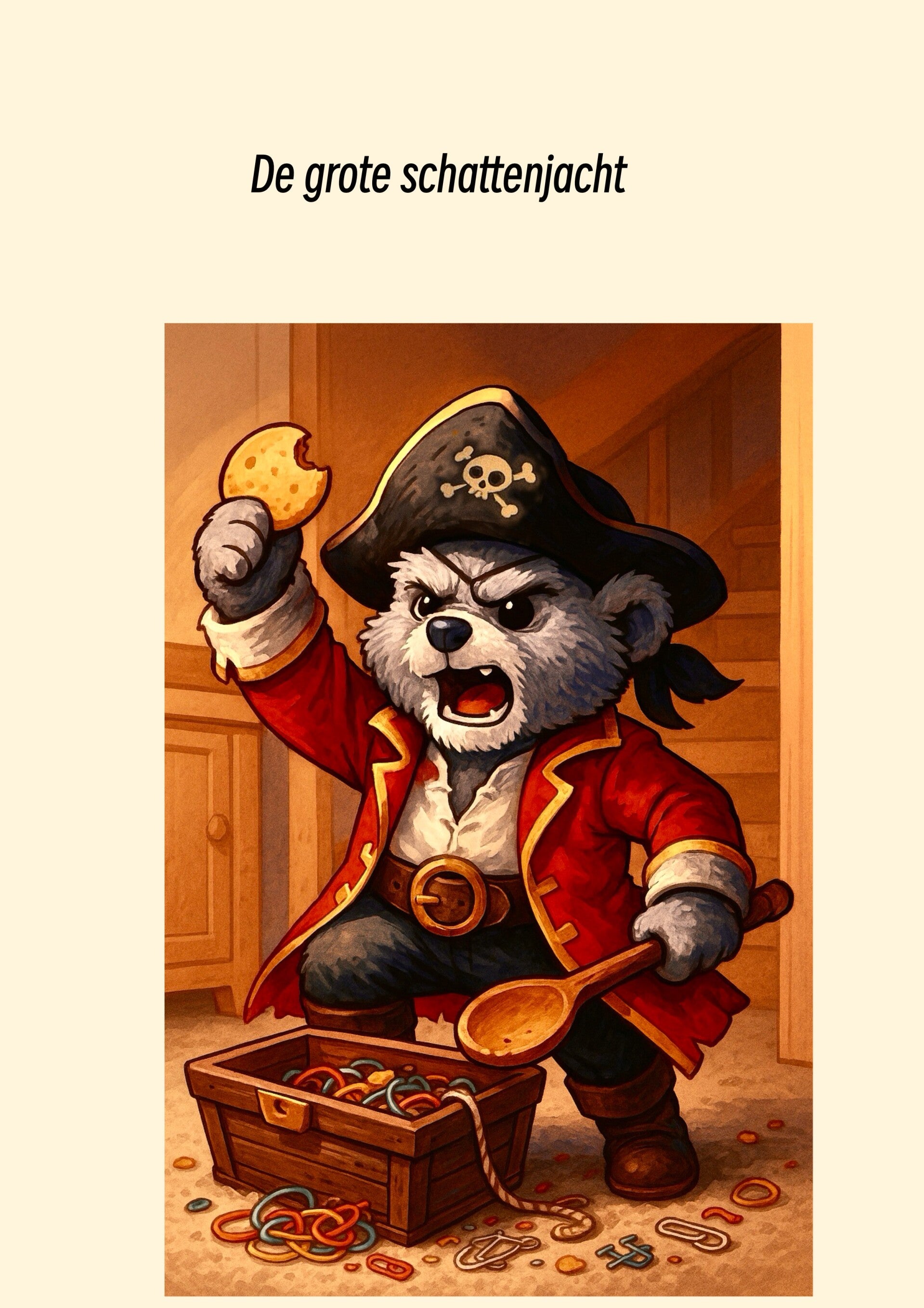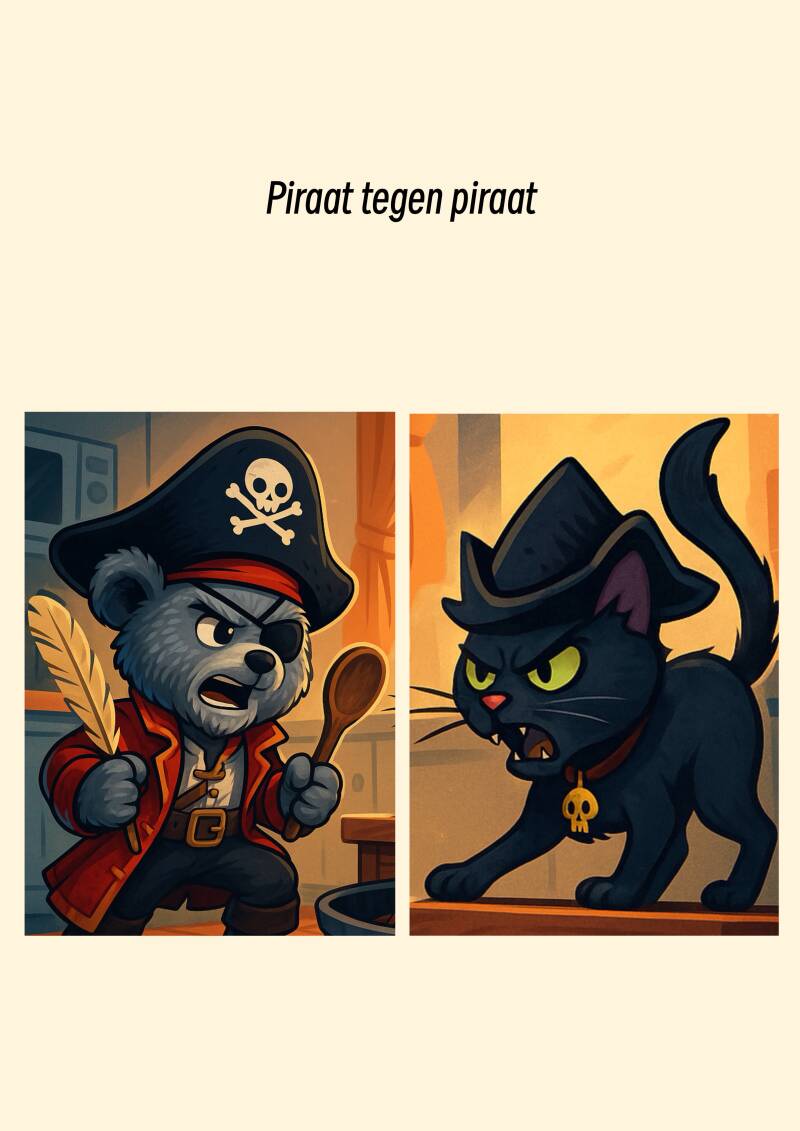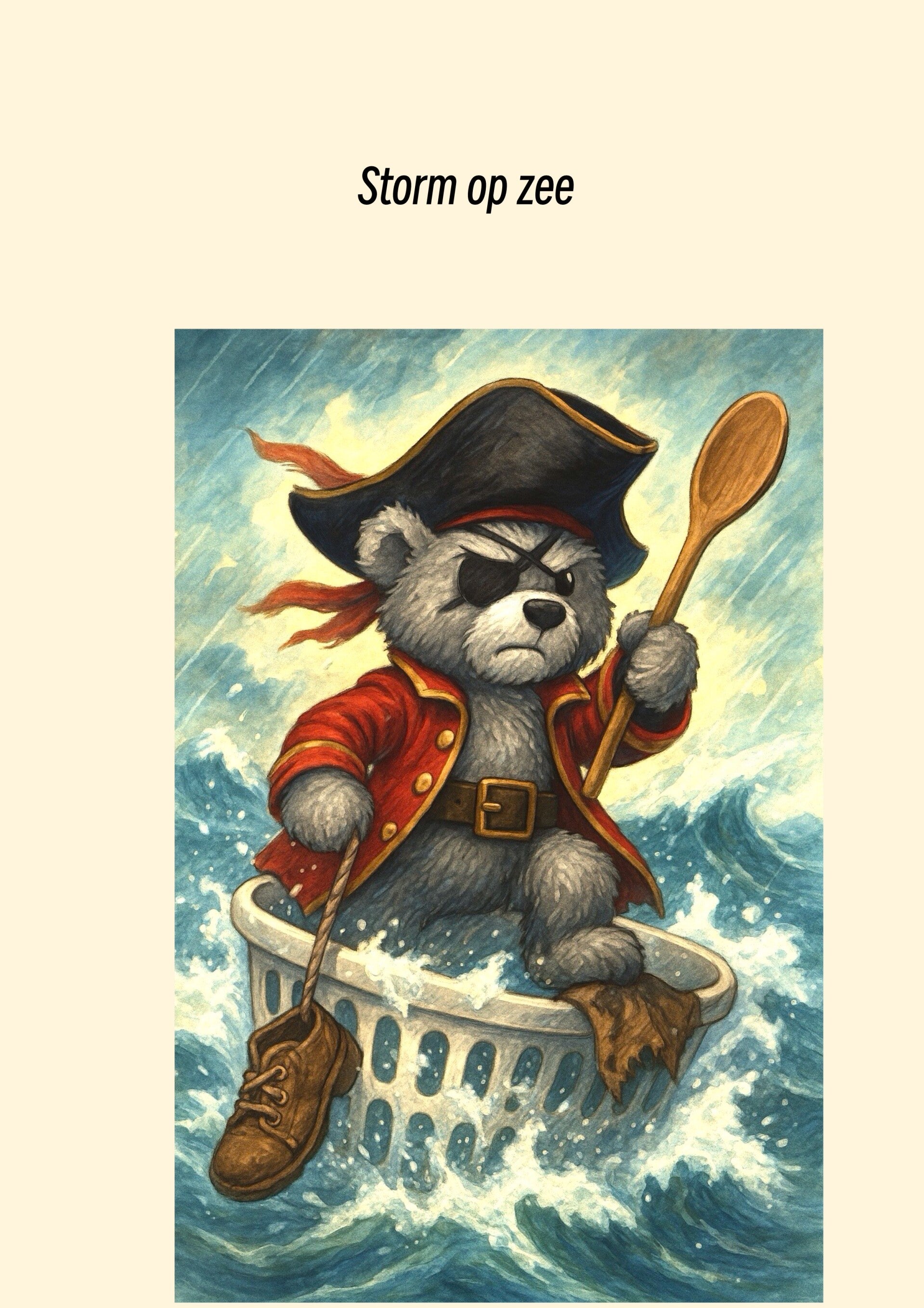 Maar Bear zwaaide met zijn houten lepel alsof het een roer was. “De vloer is de zee! De kruimels zijn haaien! En de tocht van het open raam …dat is de storm die komt.