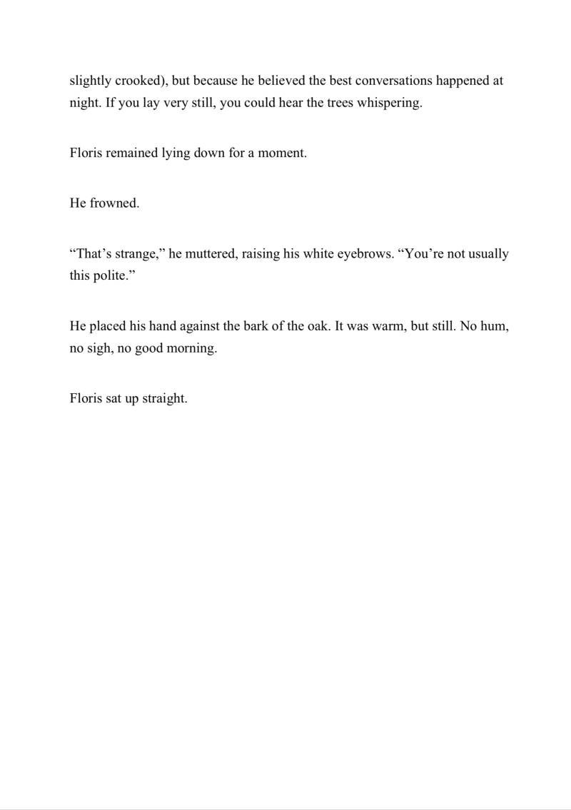 Hij lag onder de oudste eik van het bos....een boom zo oud dat niemand zich kon herinneren wanneer hij ooit een eikel was geweest. Floris sliep daar vaak. Niet omdat hij geen huis had (dat had hij wel , een keurig huis met een deur die altijd een beetje scheef hing) , maar omdat hij vond dat de beste gesprekken ‘s nachts gebeurden. Als je heel stil bleef liggen hoorde je de bomen fluisteren.